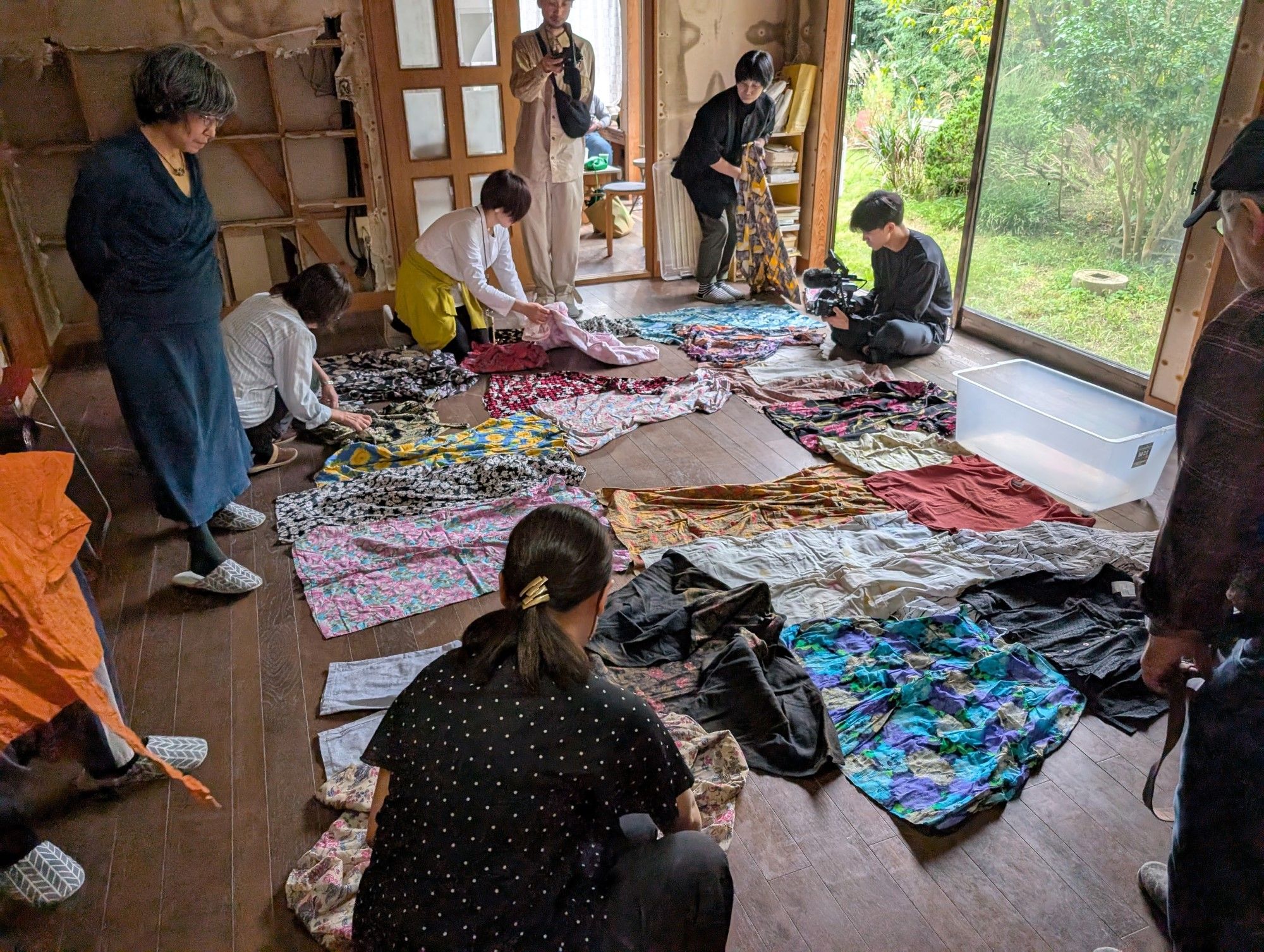 WS1日目、まずはちばさんの案内で〈家〉の中を巡った。居間の本棚には砂のこびりついた『石巻史』全集が残されており、挟みこまれていた石巻の古地図を囲み、地元からの訪問者たちが震災の前と後の地域の記憶を重ねて語り合う。玄関横の戸を引くと、中身の入ったたくさんの靴箱。そこからの流れで私たちは、あの衣装ケースを開いて中の服を1枚ずつ取り出した。あたたかな陽が降り注ぐ居間の床に、カラフルな服が花畑のように敷き詰められていく。